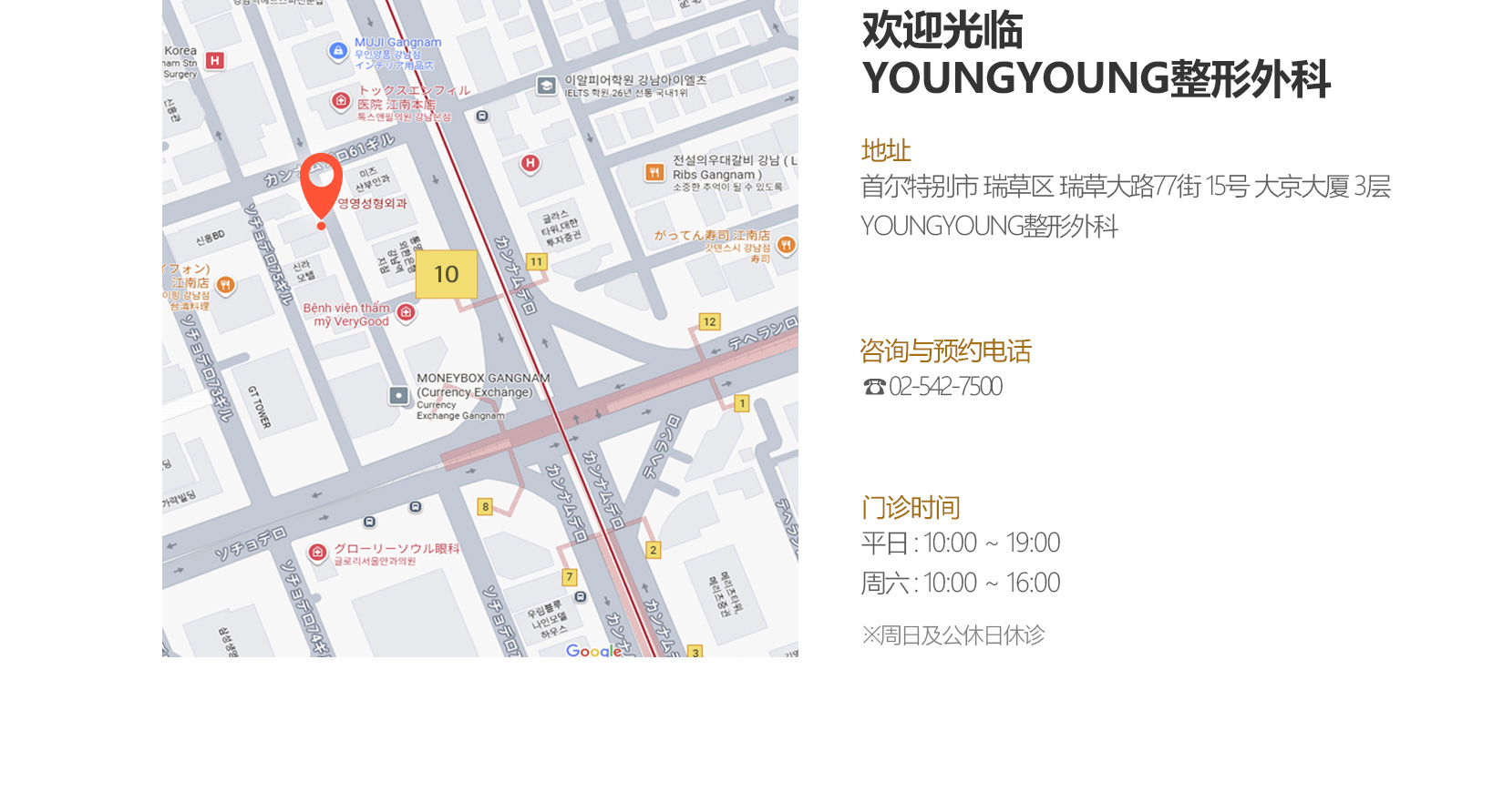 欢迎光临 Young Young美容外科 地址:首尔市 江南区 论岘路837号 7楼 Young Young美容外科 交通:地铁7号线 清潭站 14号出口步行3分钟 电话:+82-2-542-7500 KakaoTalk:@youngyoungps