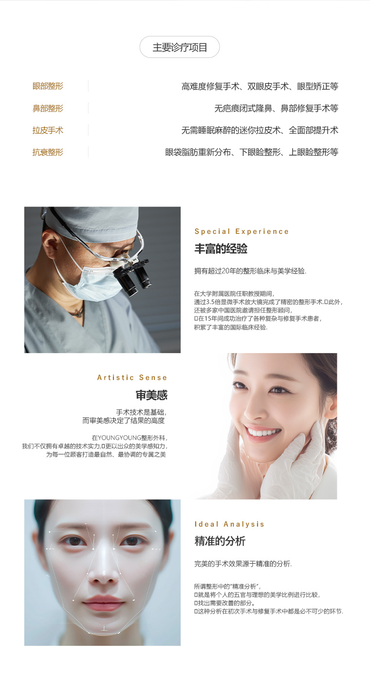 凭借丰富的整形外科经验与活跃的学术活动, Young Young美容外科致力于为客户提供安全、可信赖的美容医疗服务。